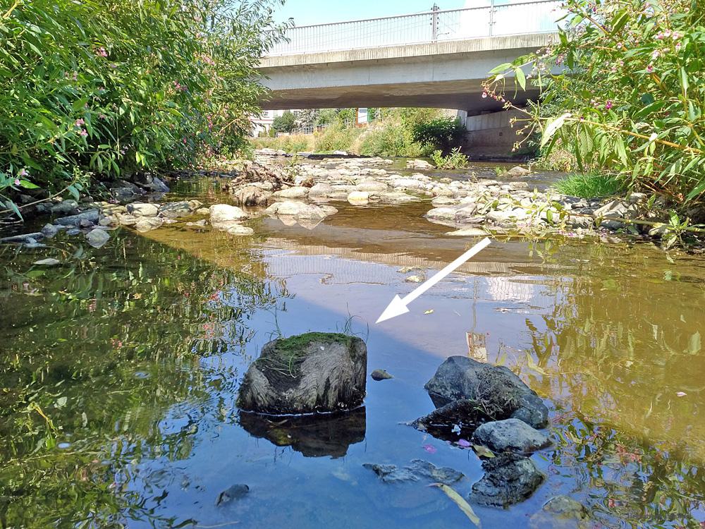 Bei der Dia-Aufnahme oben sehen wir rechts neben dem rechten Pfeiler den Vorfluter*. Diesen gab es in Verbindung mit der „Oberförsterbrücke“. Der Vorfluter existiert heute nicht mehr, da er 1992 bei der Komplettsanierung der „Oberförsterbrücke“ zugeschüttet wurde. Eine Mauer verbindet jetzt die rechten Pfeiler der beiden Brücken.