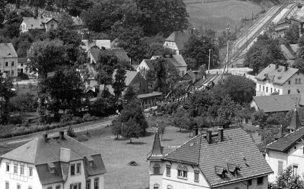 Die Aufnahme oben datieren wir auf etwa 1942. Auch hier lohnt ein Blick über die Brücke hinaus – links des Baumes ist das „Etablissement Waldesrauschen“ schemenhaft zu erkennen.