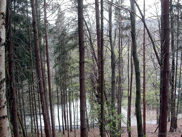 Man muss sich erst einige Meter durch dichten Nadelwald hangabwärts kämpfen, um überhaupt noch ein halbwegs sehenswertes Foto von etwa der gleichen Stelle wie oben aufnehmen zu können. So geschehen am 24. April 2005. Recht schemenhaft erkennen wir noch linker Hand den Mühlberg, von den Wieden sehen wir gar nichts. Dafür ist der Emmateich gut erkennbar, dem hier im Heimatwerk eine eigene kleine Seite gewidmet ist.