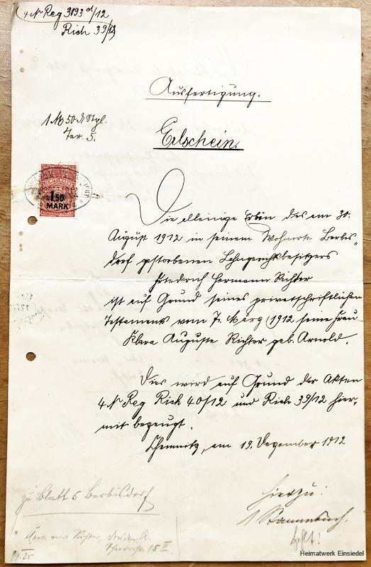 Die alleinige Erbin des am 30. August 1912 in seinem Wohnorte Berbisdorf gestorbenen Lehngerichtsbesitzers Friedrich Hermann Richter ist auf Grund seines privatschriftlichen Testaments vom 7. März 1912 seine Frau Klara Auguste Richter geb. Arnold.
