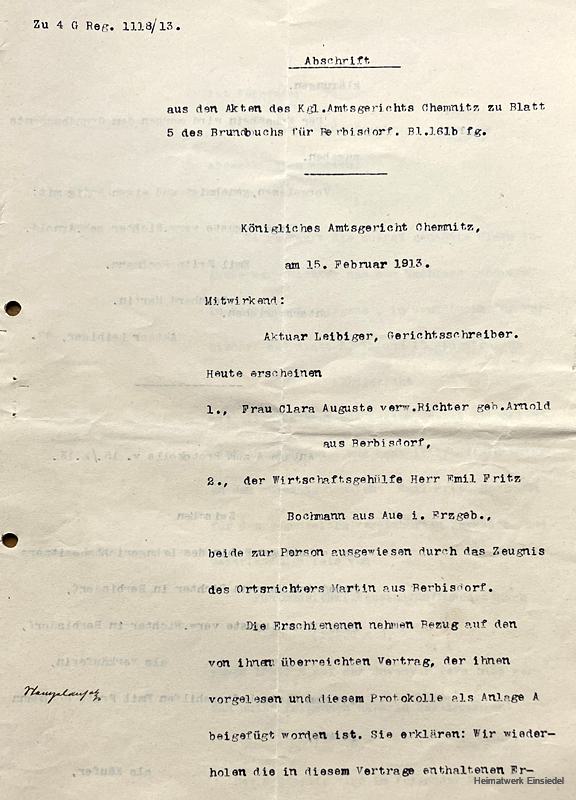 Die alleinige Erbin des am 30. August 1912 in seinem Wohnorte Berbisdorf gestorbenen Lehngerichtsbesitzers Friedrich Hermann Richter ist auf Grund seines privatschriftlichen Testaments vom 7. März 1912 seine Frau Klara Auguste Richter geb. Arnold.