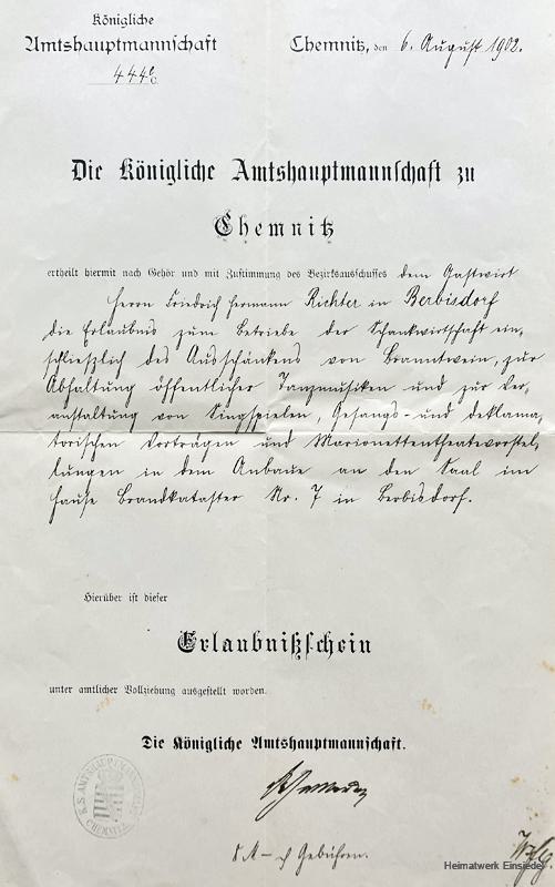 Von der unterzeichneten Königlichen Amtshauptmannschaft wird Ihnen auf das Gesuch vom 2. December dieses Jahres bez. nach Gehör und mit Zustimmung des Bezirksausschusses die Erlaubnis zum Betriebe der Gastwirthschaft, einschließlich des Ausschänkens von Branntwein, sowie zur Abhaltung öffentlicher Tanzmusiken, Concerte und Bälle, letztere unter den hierfür theils gesetzlich, theils regulativmäßig und sonstigen gesetzten Bestimmungen und Beschränkungen, in dem [unleserlich]grundstücke unter Nummer 7 des Brandversicherungscatasters für Berbisdorf, hiermit ertheilt.