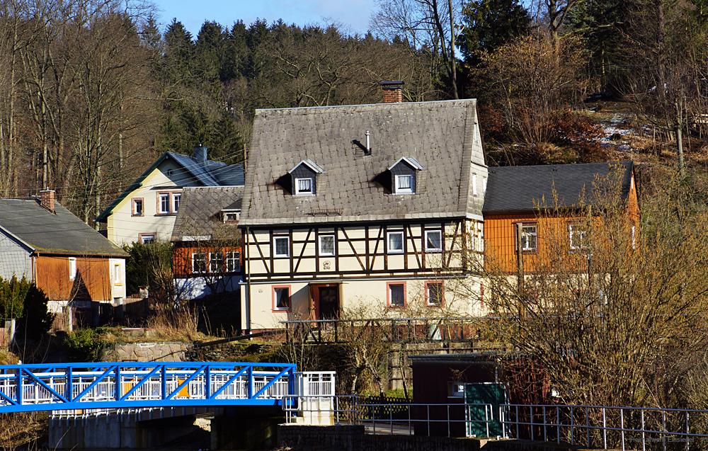 … über die Zwönitz zum Grundstück Talsperrengrund 9 und zur 2019 neu errichteten „Hahnbrücke“. Aber heute geht es um das abgebildete Gebäude, laut unseren Unterlagen das älteste bewohnte Haus in Einsiedel.