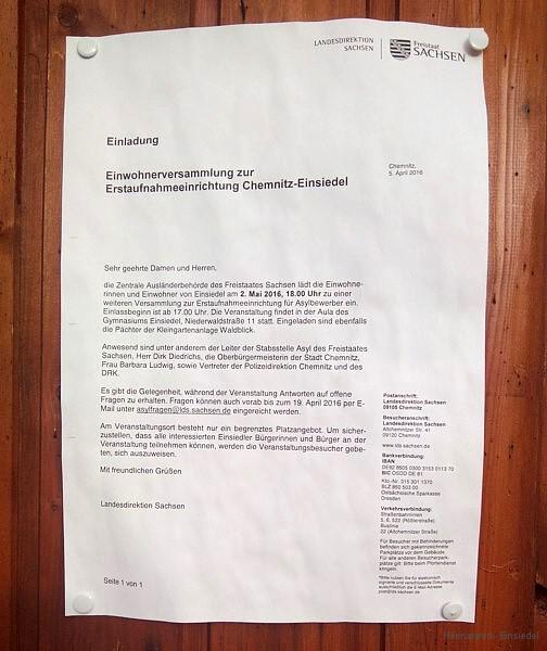 Um 18 Uhr fand im Einsiedler Gymnasium die Bürgerversammlung der Landesdirektion Sachsen (Zentrale Ausländerbehörde) statt, siehe dazu auch die Pressemeldung weiter oben.