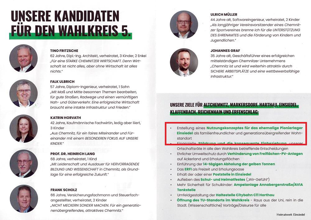 Immerhin – und das sei klar gesagt – benennt die CDU wenigstens das Thema. Im Flyer der AfD, der sich sowohl auf den Wahlkreis 5 als auch die Ortschaftsratswahl bezieht, liest man bezüglich des ehemaligen Pionierlagers keinerlei Vorschläge!