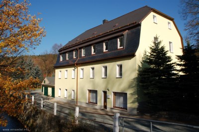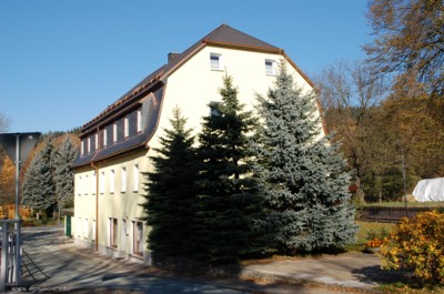 Bei diesem Haus in der Einsiedler Hauptstraße 1 handelte es sich einst um das sogenannte Beamten- bzw. Prokuristenhaus der ehemaligen Papierfabrik. Die hier links vor dem Gebäude vorbeigehende Straße führte geradewegs in die ein ganzes Stück weiter hinten liegende Fabrik. Heute endet der Weg im zum Gebäude gehörenden Grundstück.