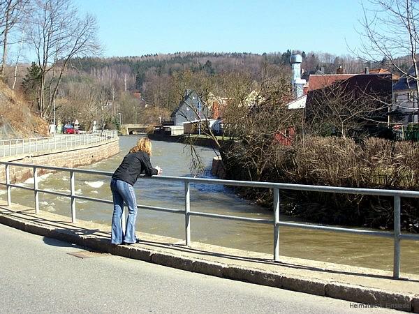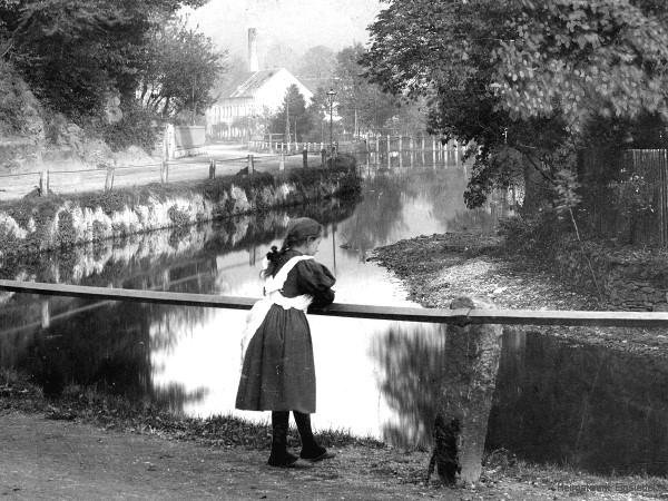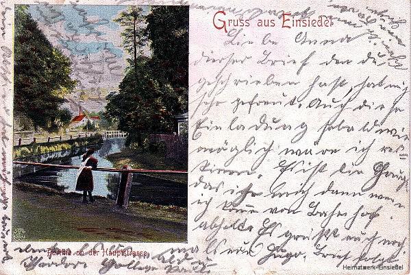 Das Motiv mit dem Mädchen am Fluss zeigt Försters Tochter Martha. Die recht bekannte Aufnahme fand große Verbreitung, nachstehend finden wir diese z.B. noch einmal als Lithografie auf einer Ansichtspostkarte (verlegt beim Verlag Karl Basler in Einsiedel).
