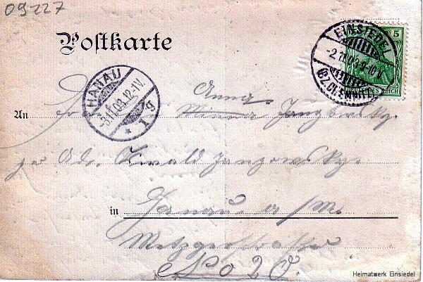 Oben rechts ist noch einmal die Vorderseite der Postkarte abgebildet. Diese wurde am 2. November 1903 im Einsiedel aufgegeben und traf bereits einen Tag später beim zuständigen Postamt in Hanau ein, wie uns der Posteingangsstempel verrät.