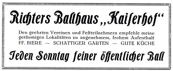 Bereits 1925 eröffneten die “Kaiserhof Lichtspiele”. Mit seinen mit rotem Cord bezogenen Klappsesseln wird dem Kino ein fast großstädtisches Flair nachgesagt und die Veranstaltungen wurden dementsprechend rege genutzt. Zu den anfangs gezeigten Stummfilmen gab es die damals übliche Klavieruntermalung. Der Lichtspielsaal hatte 439 Sitzplätze.