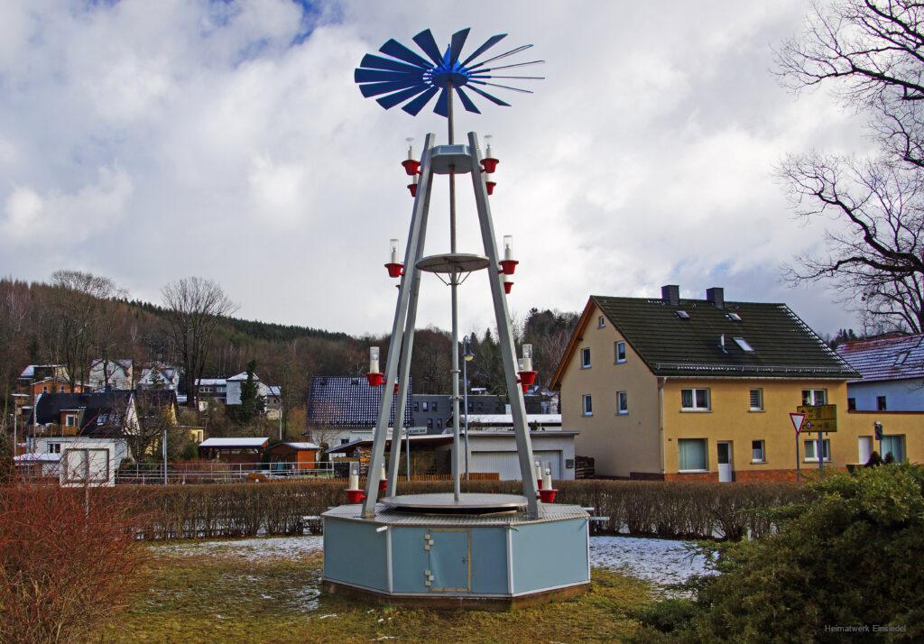 (…) Das Familienkollektiv [Fam. Glöß] erfüllte in den letzten Wochen eine schöne, zusätzliche Aufgabe. Für die Heimatgemeinde wurde eine riesige Pyramide gebaut, deren Podium einen Durchmesser von vier Metern aufweist; der Meister [Werner Glöß] schätzt das Gewicht auf 25 Zentner. In neun Meter Höhe dreht sich das große Flügelrad an der Pyramide vor der Post in Einsiedel. Auf den drei Tellern laufen Lampionkinder, Bergmänner, Postbote, Braumeister, Jäger und Nußknacker. Die Gemeinde Einsiedel ist um ein schönes Stück Heimatgeschichte reicher, an dem sich Einwohner und Ortsfremde erfreuen.