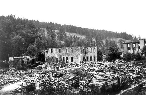 Die in den Grundmauern erhaltene Ruine in der Bildmitte gehört zum Lißner-Bauer, von der Tischlerei Weißer blieb nur der Schutt im Vordergrund. Totalzerstörung! Der Begriff „…bis auf die Grundmauern“ wurde hier traurige Realität. Die Ruine am rechten Bildrand gehört zur Verbandwattefabrik Gustav Lippmann.