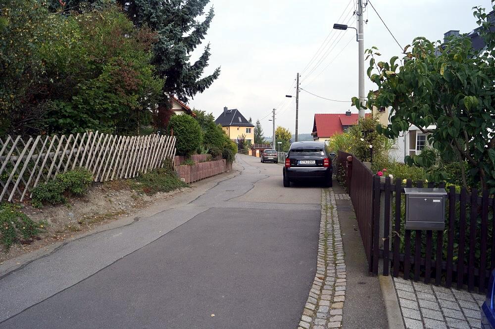 Ein kleiner “Seitenarm” zwischen den Hausnummern 4 und 10 ist der Zugang zum Doppelhaus 6 und 8. Dieser Ausläufer endet auch am Harthauer Weg, ist sehr schmal und steil und mit Pkws schlecht befahrbar (gelber Pfeil & Foto rechts).